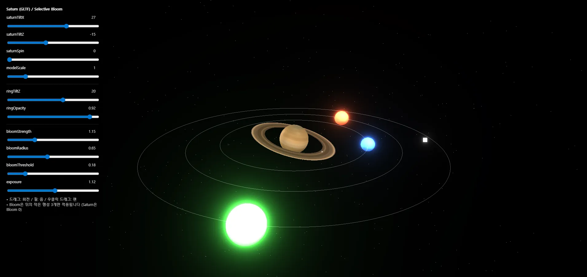 행성 같은걸 three js 로 직접 그리기도 가능하지만, 크기나 질감, 조명같은 효과들을 넣을 수록 그만큼 코드도 길어져서 관리가 힘들더라구요.