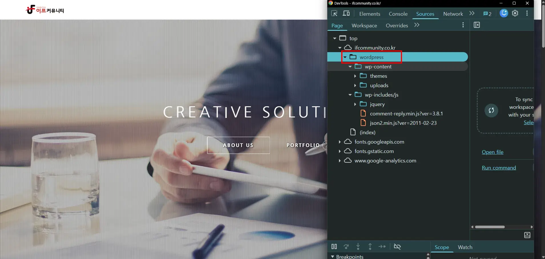 Source 탭을 보면 WordPress 폴더를 볼 수 있듯이 기존에는 전문지식이 크게 없어도 블로그를 쉽게 구축할 수 있는 도구인 WordPress 로 구축이 되었었는데요.