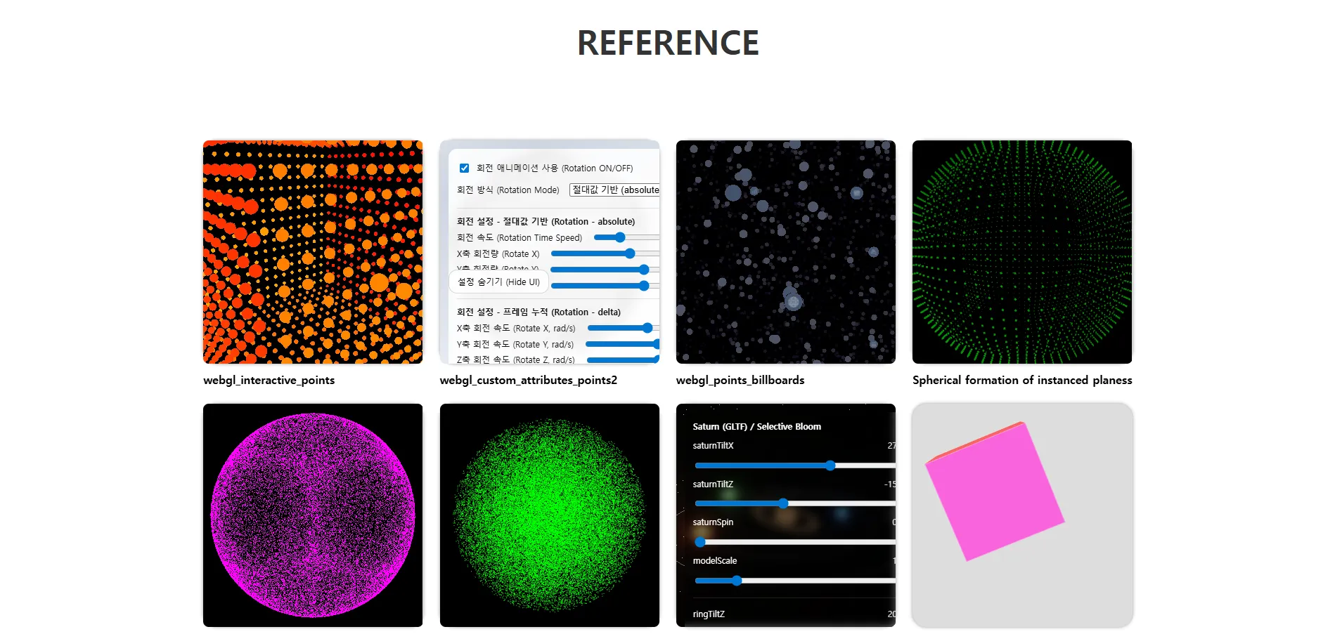 three.js 자체가 진입장벽이 좀 높은 편이긴한데, 그래도 예제가 많이 있어서 있는 예제에 조금 디벨롭하여 써도 된다는게 장점입니다.
